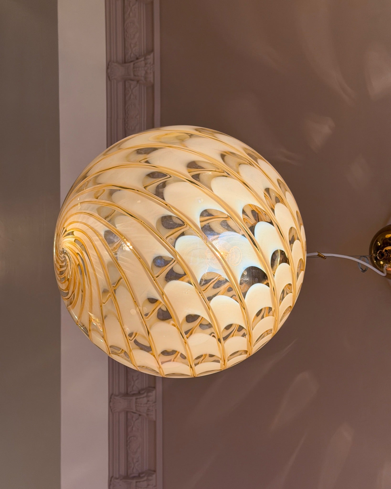 The lamp creates a beautiful play of light and shadows in any room due to its transparent glass and beautiful unique swirl pattern.