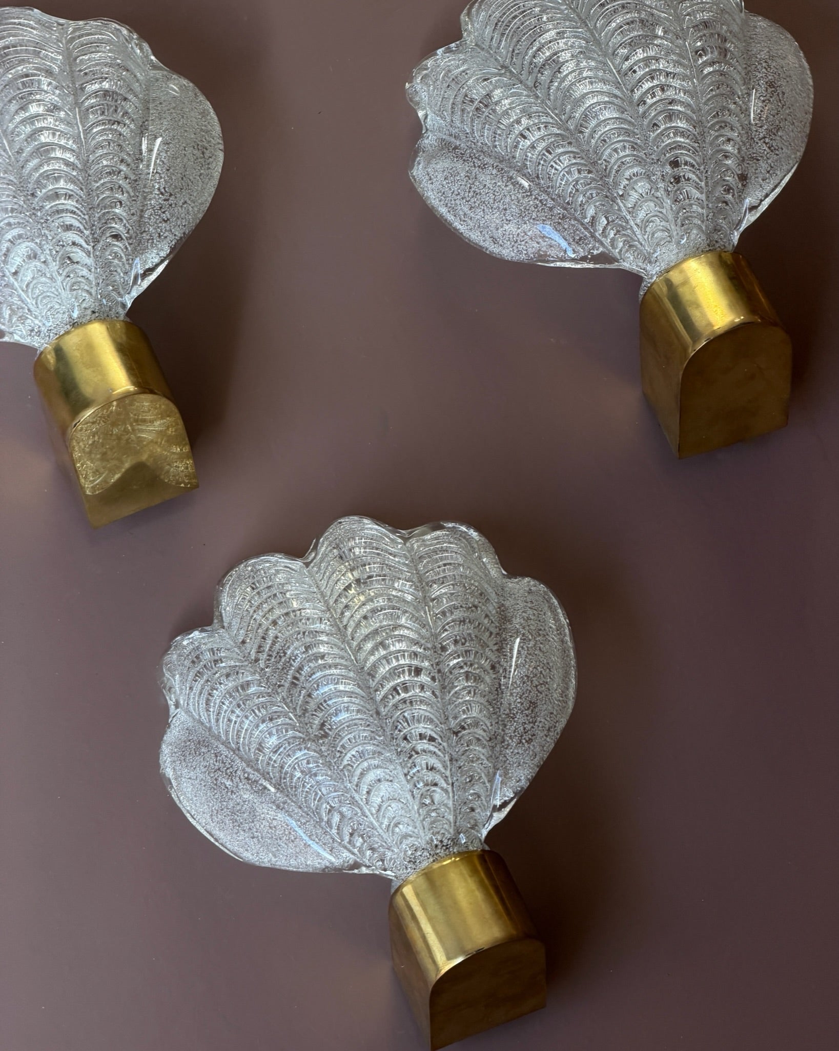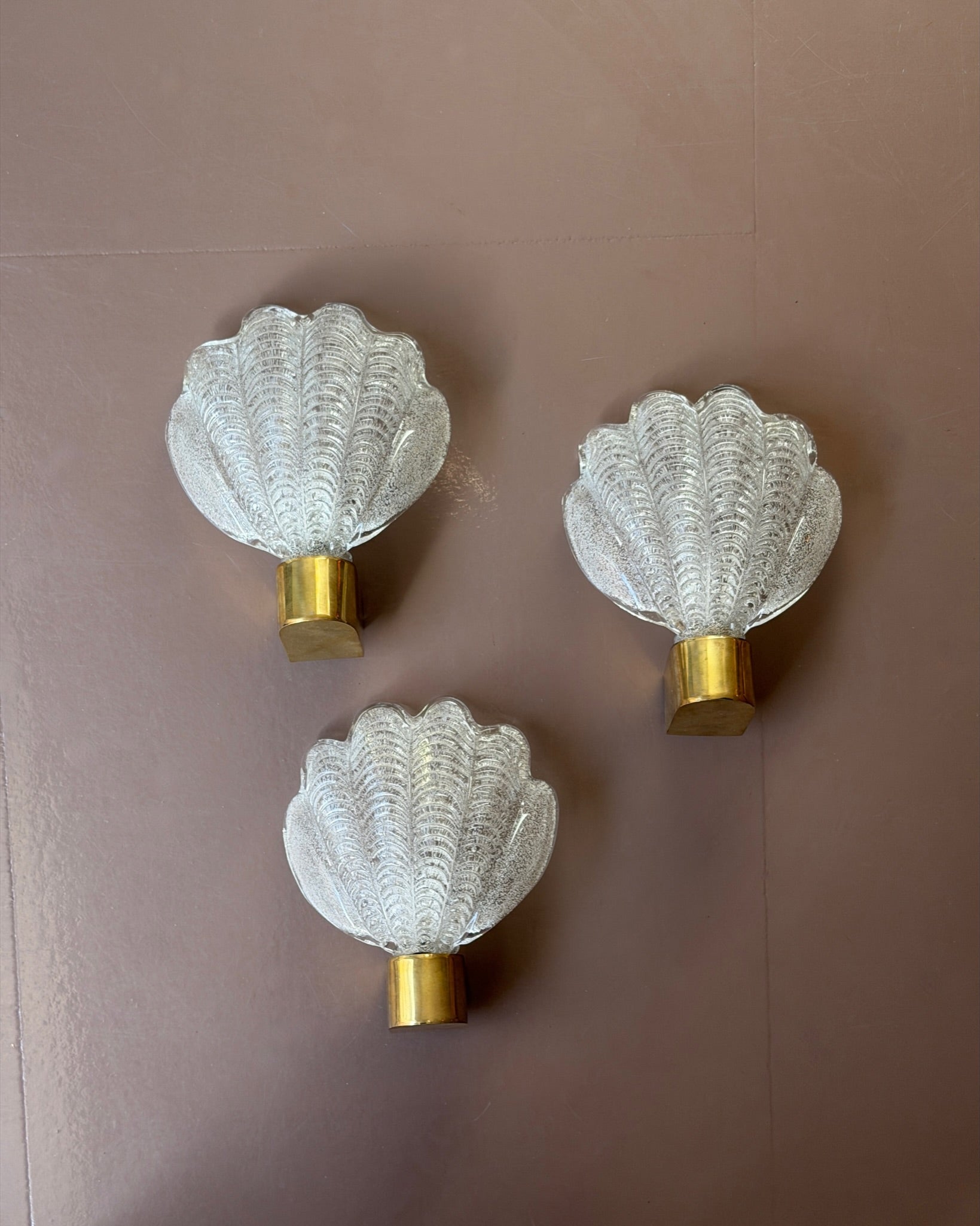 The Murano glass shaped like an elegant seashell. The glass is mounted on a discreet brass fitting, giving the lamp a classic and timeless appearance. The organic shape and transparent glass create a beautiful, soft light when the lamp is turned on, highlighting the texture and craftsmanship of the glass.